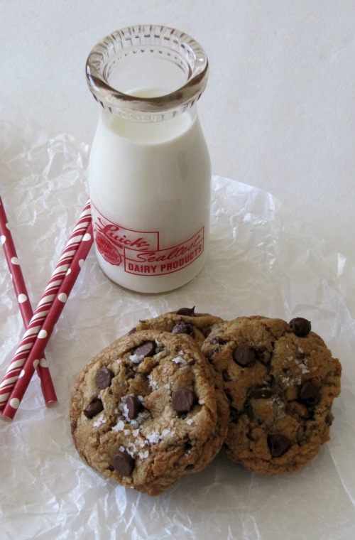 Roll dough into 3 tablespoon sized balls (they should be big; almost a 1/4 cup), then place on prepared sheet and sprinkle with a little sea salt. Place baking sheets in preheated 375 oven and bake for 11-14 minutes, or until golden at the edges but still soft in the middle. Let cookies cool for 5 minutes on the sheet before transferring to a wire wrack to cool completely.